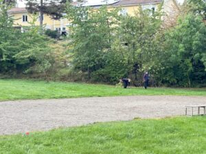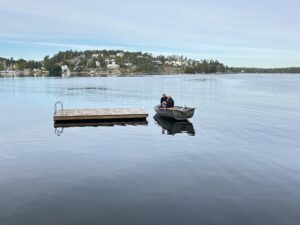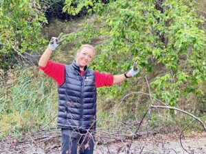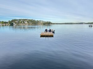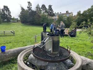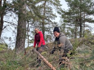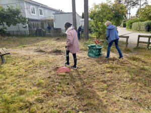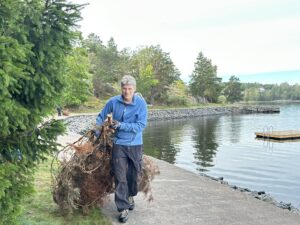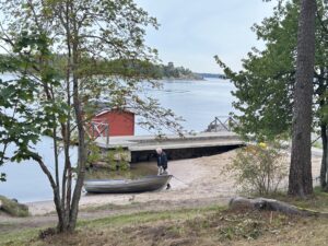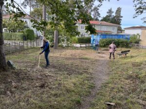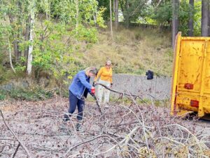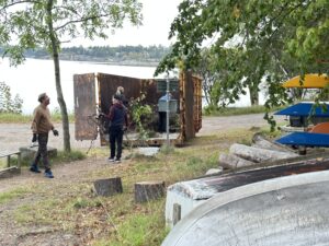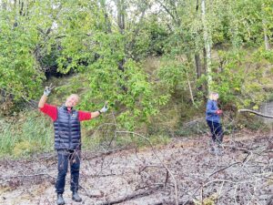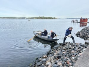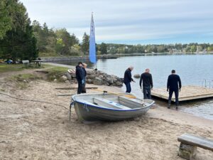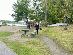 Vi samlades vid grillen nere på ängen för att dela in oss i grupper. Efter sommarens stormar hade vi fokus på att ta reda på det som fanns kvar av de träd som rasat och även röja sly. Som vanligt tog vi upp flotten och båtar för att vintra dem.